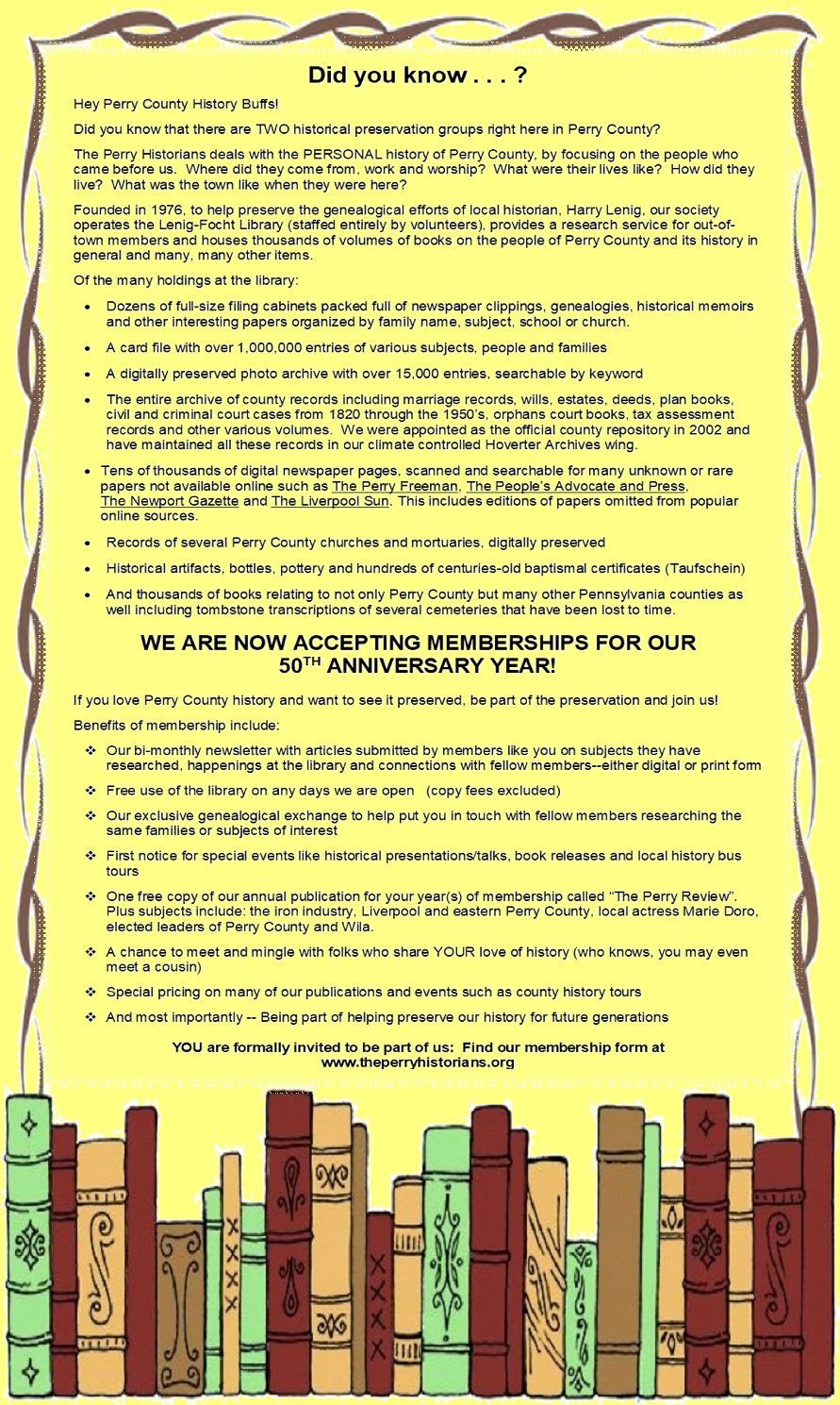 The Perry Historians is an all volunteer organization concerned with the heritage of Perry County as revealed through the lives of individuals and families. We are actively preserving and organizing the source materials and representative artifacts relative to the Genealogical History of Perry County and adjacent areas. We have restored a brick country schoolhouse and erected a concrete vault to house and use our holdings. We have added a two-story addition as well as recently added, through gracious donations and grants, an environmentally controlled repository and are currently in the process of creating a display room and museum to hold and expand our accessions. In addition to our own collection, we hold the collection of the late Harry W. Lenig for whom the library is named, Ardella Ebersole, Louella Sweigert and others. Your participation through a membership will allow us to continue our many projects of procuring and preserving the records and artifacts of our heritage and providing safe and proper housing for them so they will be available to this and many future generations.