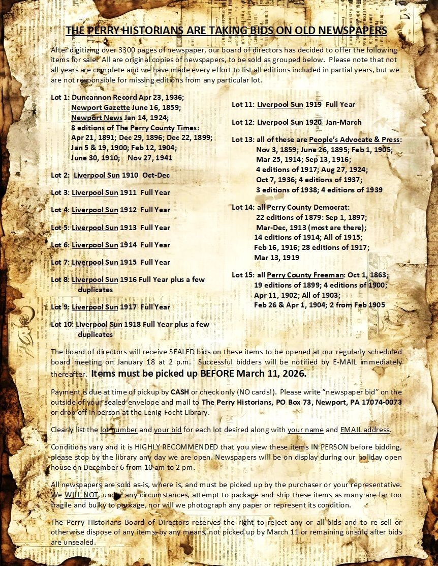 The Perry Historians is an all volunteer organization concerned with the heritage of Perry County as revealed through the lives of individuals and families. We are actively preserving and organizing the source materials and representative artifacts relative to the Genealogical History of Perry County and adjacent areas. We have restored a brick country schoolhouse and erected a concrete vault to house and use our holdings. We have added a two-story addition as well as recently added, through gracious donations and grants, an environmentally controlled repository and are currently in the process of creating a display room and museum to hold and expand our accessions. In addition to our own collection, we hold the collection of the late Harry W. Lenig for whom the library is named, Ardella Ebersole, Louella Sweigert and others. Your participation through a membership will allow us to continue our many projects of procuring and preserving the records and artifacts of our heritage and providing safe and proper housing for them so they will be available to this and many future generations.