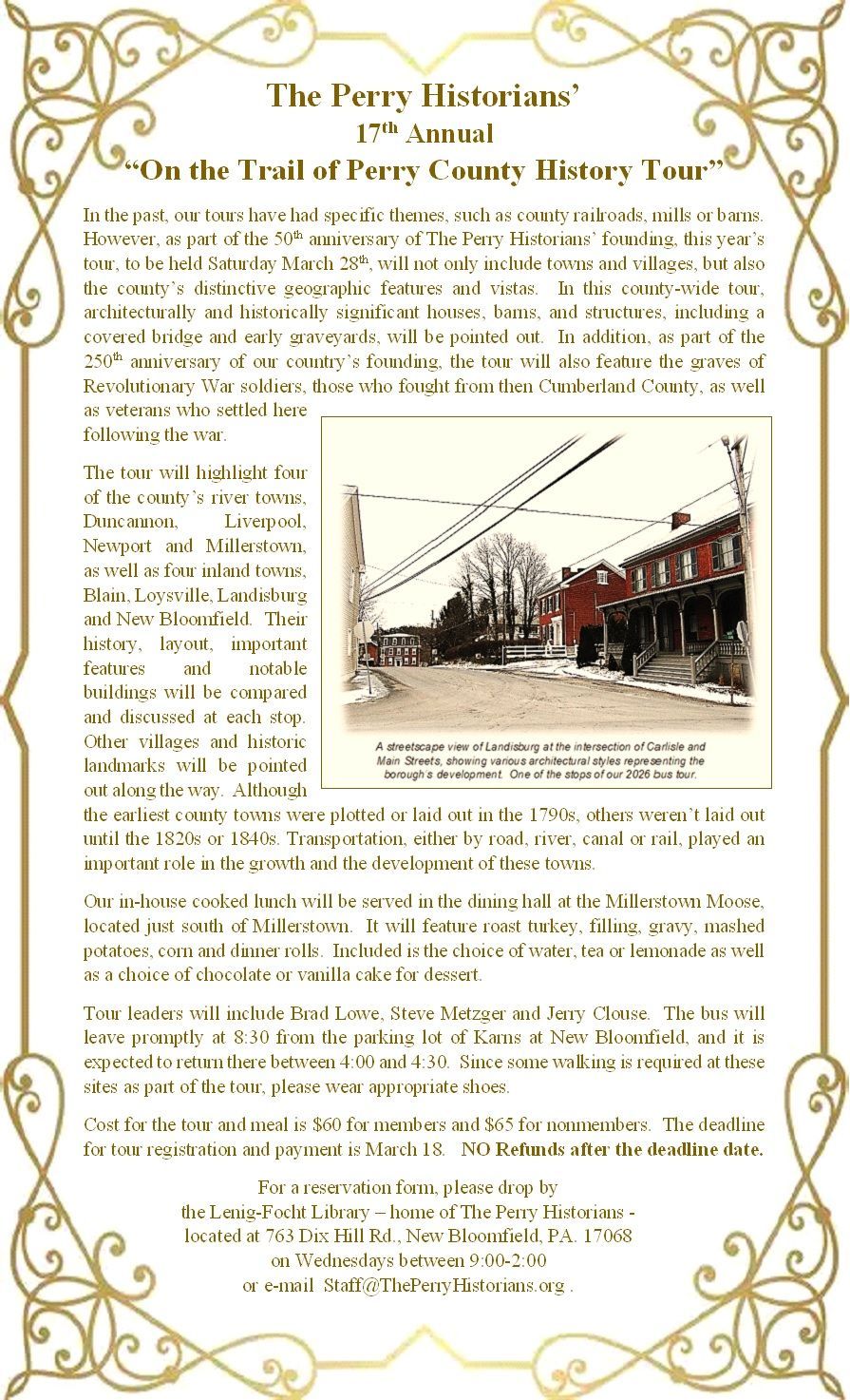 Did he fight for American Independence in 1776 or remain a Loyalist? Were they active in the life of the church and community? What were their occupations? Did they live in a log, frame, stone or brick house? When we learn the answers to these questions the buildings, people, and locations in Perry County and the whole world take on a special importance and receive the respect due them and the genealogical historian gains a valuable awareness of the contributions of his/her ancestors to the advancement of civilization.